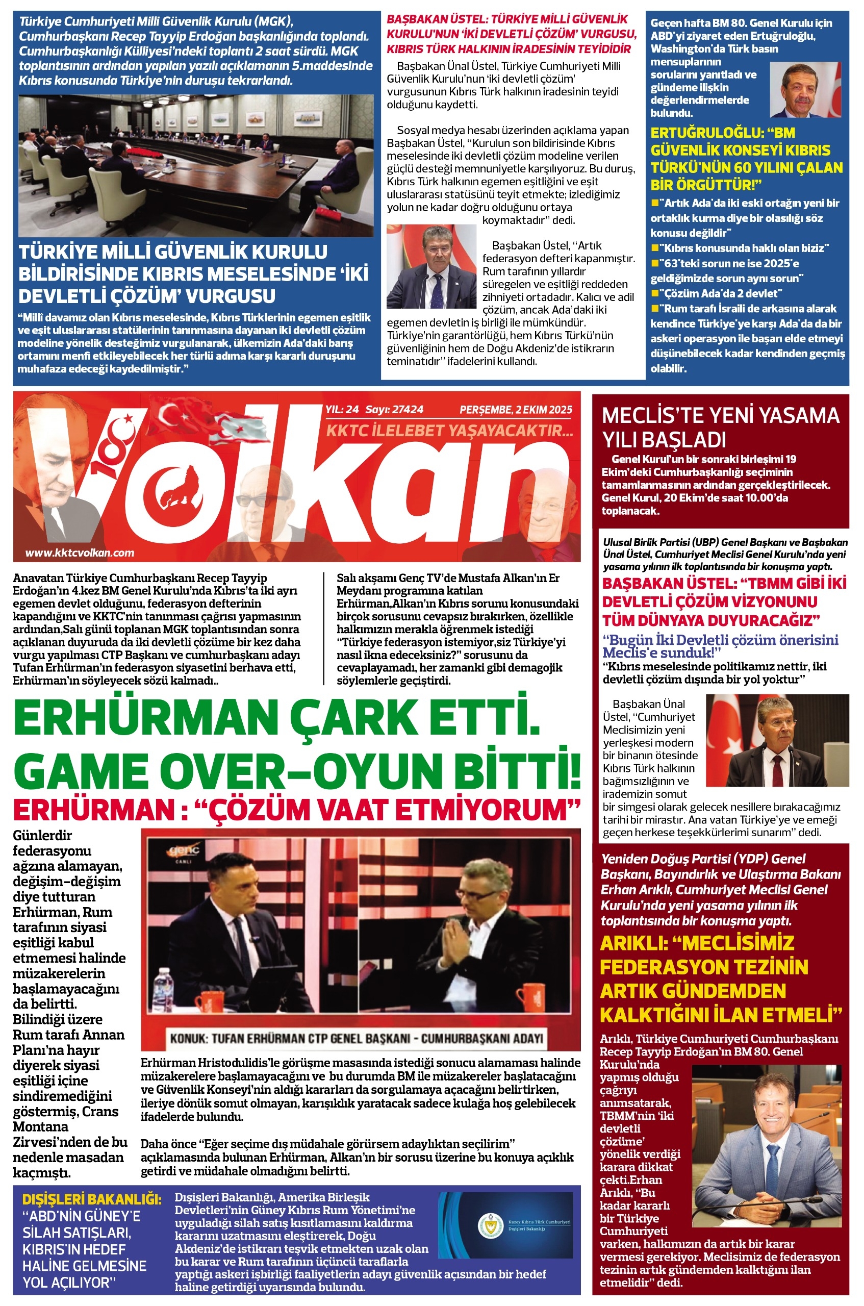Anavatan Türkiye Cumhurbaşkanı Recep Tayyip Erdoğan’ın 4.kez BM Genel Kurulu’nda Kıbrıs’ta iki ayrı egemen devlet olduğunu,federasyon defterinin kapandığını ve KKTC’nin tanınması çağrısı yapmasının ardından,Salı günü toplanan MGK toplantısından sonra açıklanan duyuruda da iki devletli çözüme bir kez daha vurgu yapılması CTP Başkanı ve cumhurbaşkanı adayı Tufan Erhürman’ın federasyon siyasetini berhava etti, Erhürman’ın söyleyecek sözü kalmadı..